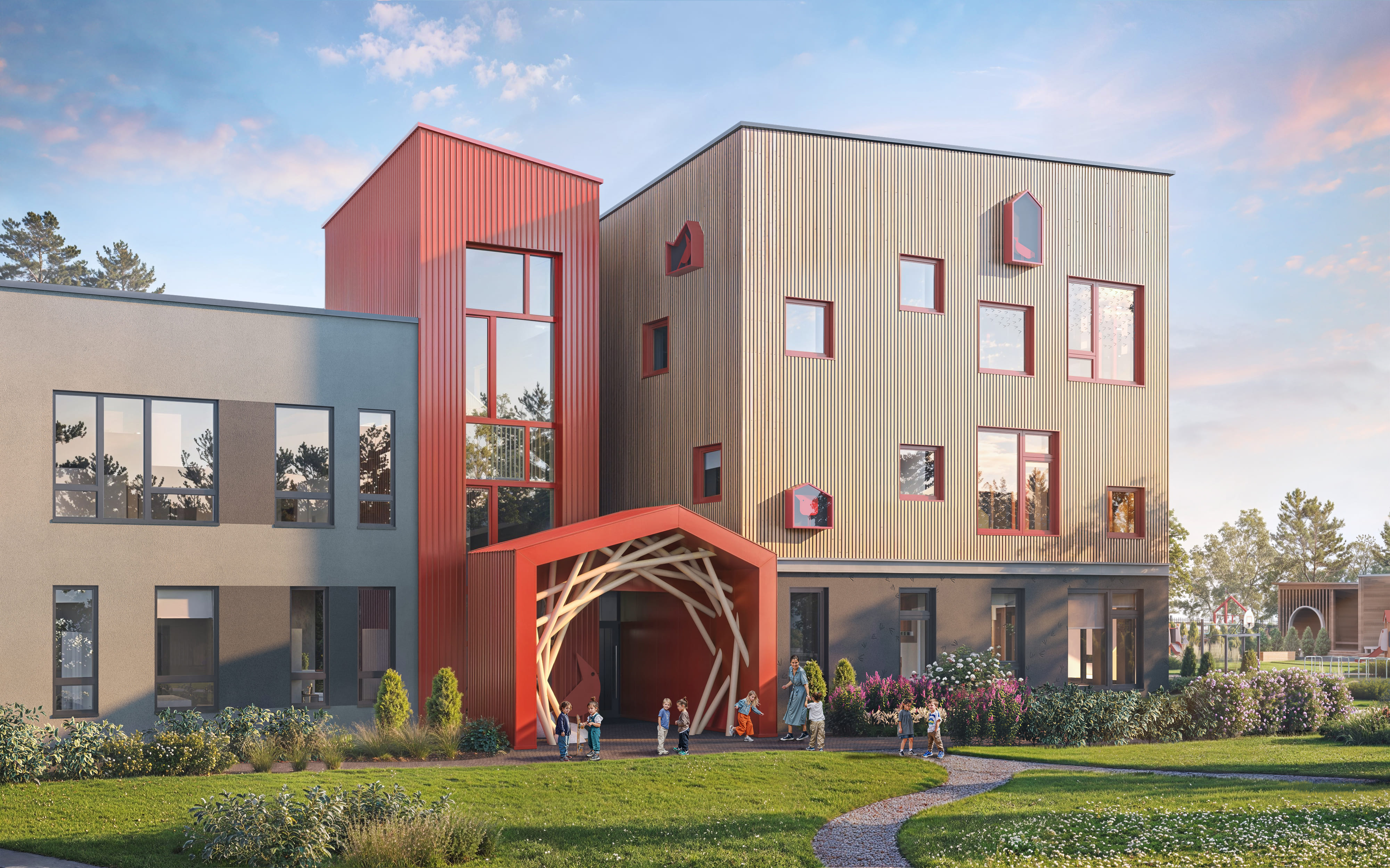 Концепция сада продиктована близостью к заказнику «Стиклево», где обитают редкие охраняемые птицы. Тема пернатых стала лейтмотивом всего проекта: фасад украшен декоративными скворечниками, входная группа напоминает гнездышко, а изображения птиц в интерьере помогают детям ориентироваться в пространстве. В цветовой гамме интерьеров дизайнеры использовали яркие цвета для активных зон и спокойные природные оттенки — для спален и групповых помещений.