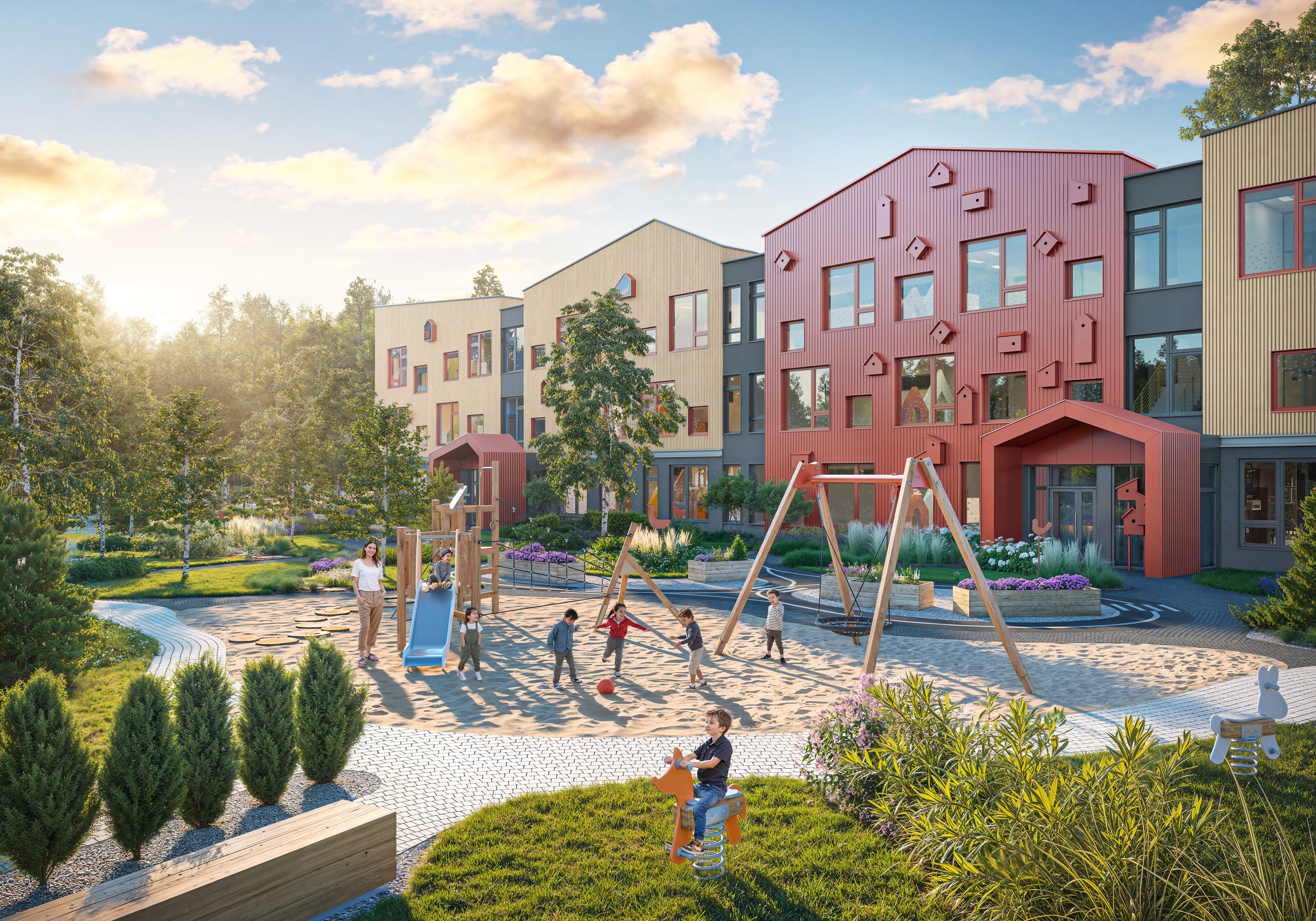 На благоустроенной территории сохранили взрослые деревья, создающие естественную тень. Здесь установлены игровые комплексы, качели, карусели, закрытые песочницы и спортивная площадка. От дождя детей укроют деревянные навесы. Тема птиц продолжена и в ландшафтном дизайне: по всей территории «расселились» декоративные пернатые, а уточка с утятами «отправляется на прогулку».