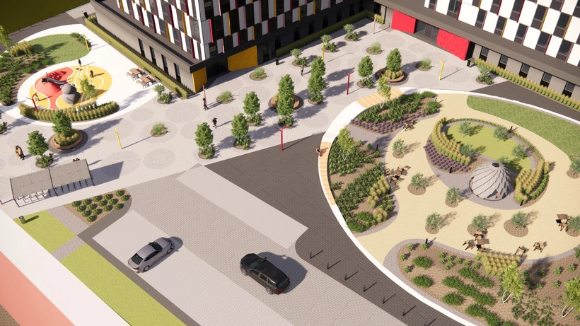 - 2 корпуса: 7-этажный взрослый блок и 4-этажный детский блок