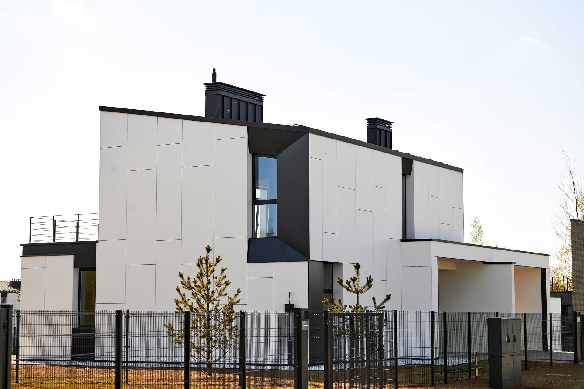 One of the most distinguishable features of cottages in “Zelenaya Gavan” are huge panoramic windows and wide terraces. The decoration of the facades is created with the use of a combination of different materials: larch, fibre cement panels, hyper-pressed tiles, folded metal — this is what gives each house its own personality and character.